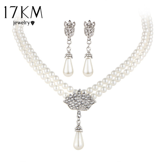 17KM Charming Bride Simulated Pearl Jewelry Set Bling Crystal Water Drop Pendant Necklaces Earring Fashion Jewelry Accessory