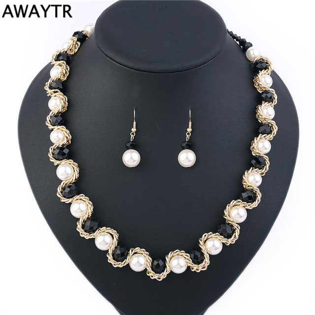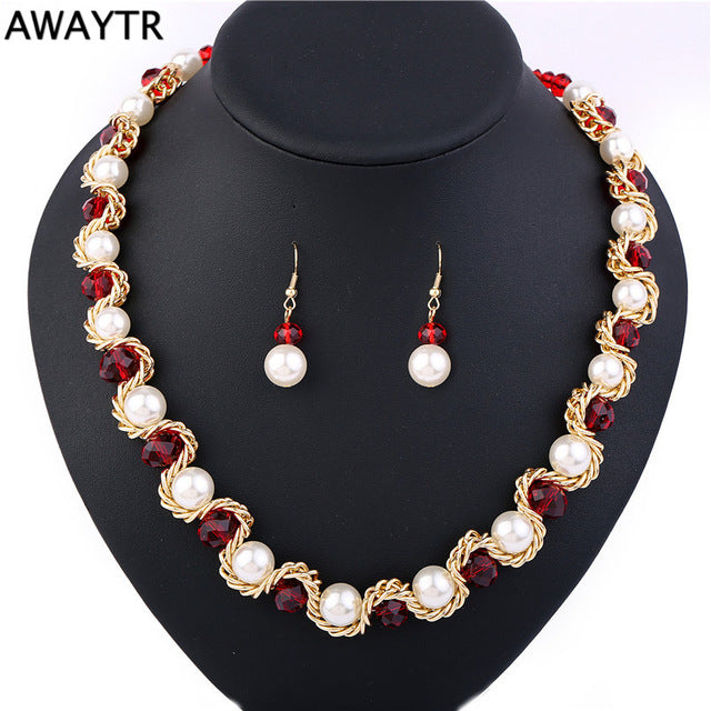 AWAYTR 2017 Elegant Women Crystal Pearl Jewelry Set New Costume Simulated-pearl Necklace Earrings Jewelry Sets For Wedding Gift